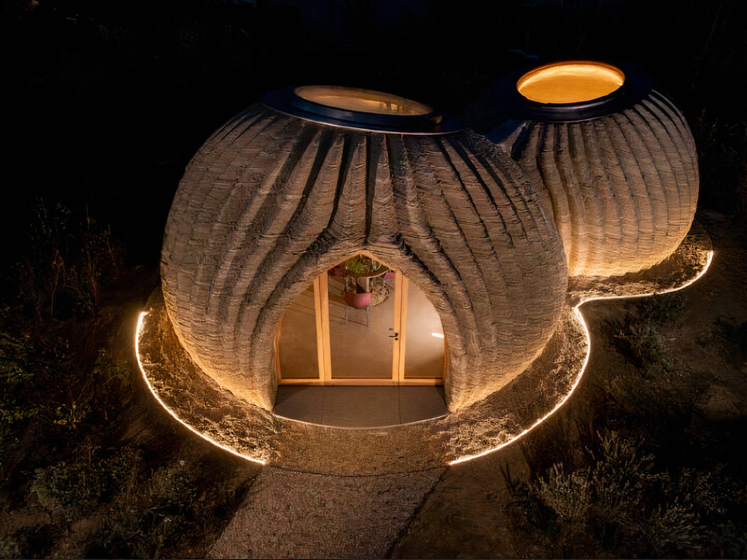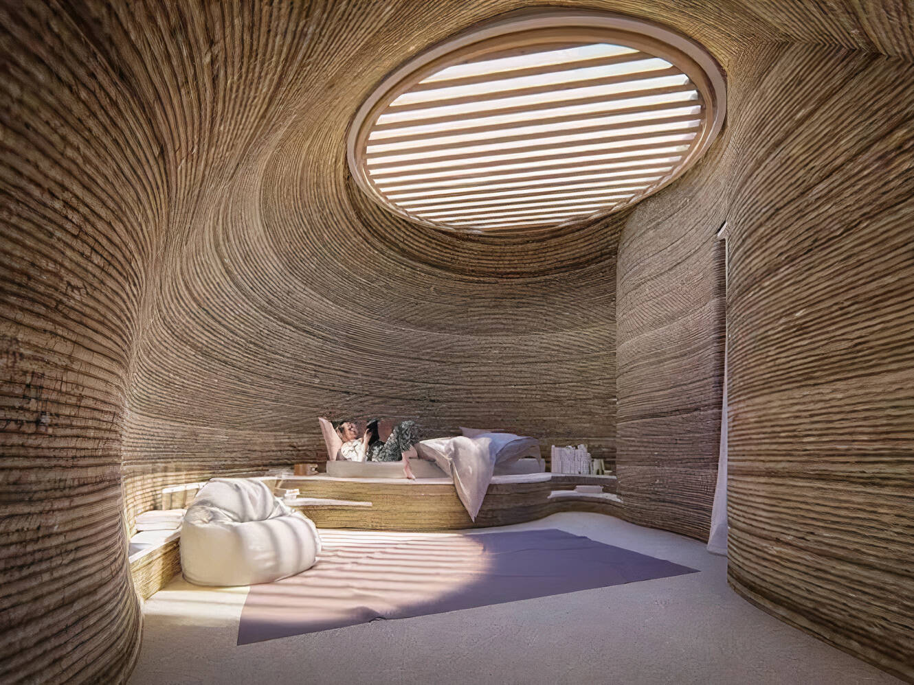 With nearly 650 square feet of interior space, TECLA comprises a “living zone” with a sun-lit kitchen, and a “night zone” with a bedroom and bath. “The furnishings—partly printed with local earth and integrated into the raw-earth structure, and partly designed to be recycled or reused—reflect the philosophy of a circular house model”. Two ocular skylights invite ample natural light inside